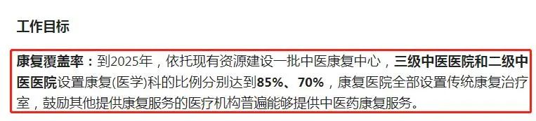 《通知》指出到2025年,依托現(xiàn)有資源布局建設(shè)一批中醫(yī)康復(fù)中心,三級中醫(yī)醫(yī)院和二級中醫(yī)醫(yī)院設(shè)置康復(fù)(醫(yī)學(xué))科的比例分別達到85%、70%,康復(fù)醫(yī)院全部設(shè)置傳統(tǒng)康復(fù)治療室,鼓勵其他提供康復(fù)服務(wù)的醫(yī)療機構(gòu)普遍能夠提供中醫(yī)藥康復(fù)服務(wù)。