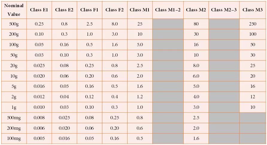談到校準(zhǔn),起到至關(guān)重要作用的就是砝碼。砝碼的形狀、尺寸、材料、表面狀況、密度、磁性、質(zhì)量標(biāo)稱值、最大允許誤差等指標(biāo)都有非常嚴(yán)格的規(guī)定。作為標(biāo)定、校驗(yàn)衡器的最普遍也是最重要的工具,國際法制計(jì)量組織(OIML)對砝碼進(jìn)行了明確的等級劃分,共分為9個(gè)等級。在砝碼的眾多指標(biāo)當(dāng)中,和校準(zhǔn)關(guān)聯(lián)度最高的就是最大允許誤差(MPE)了,國際相關(guān)法規(guī)條款對各個(gè)等級的砝碼的MPE有明確的規(guī)定,以下表格是對電子天平所常用質(zhì)量標(biāo)稱值砝碼MPE的說明(誤差值以毫克為單位):