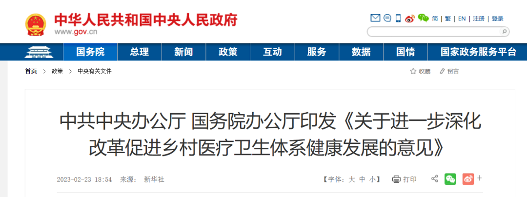 2月23日,國務(wù)院印發(fā)《關(guān)于進(jìn)一步深化改革促進(jìn)鄉(xiāng)村醫(yī)療衛(wèi)生體系健康發(fā)展的意見》。