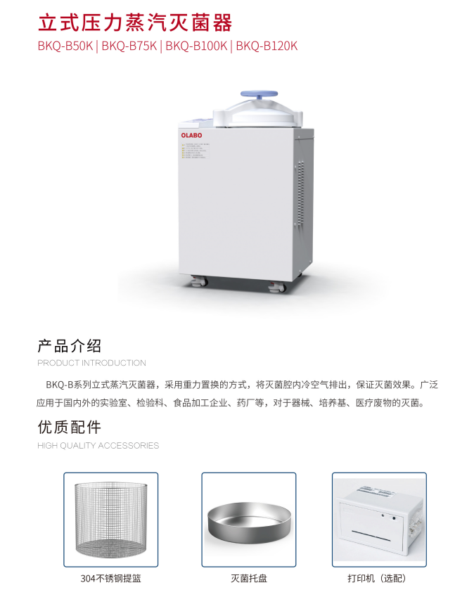 歐萊博BKQ-B系列立式蒸汽滅菌器,共有BKQ-B50K、BKQ-B75K、BKQ-B100K、BKQ-B120K四個(gè)型號(hào),適用于針對(duì)不同容積產(chǎn)品的滅菌需求。其采用重力置換的方式,將滅菌腔內(nèi)冷空氣排出,保證滅菌效果。廣泛應(yīng)用于國(guó)內(nèi)外的實(shí)驗(yàn)室、檢驗(yàn)科、食品加工企業(yè)、藥廠等,對(duì)于器械、培養(yǎng)基、醫(yī)療廢物的滅菌。