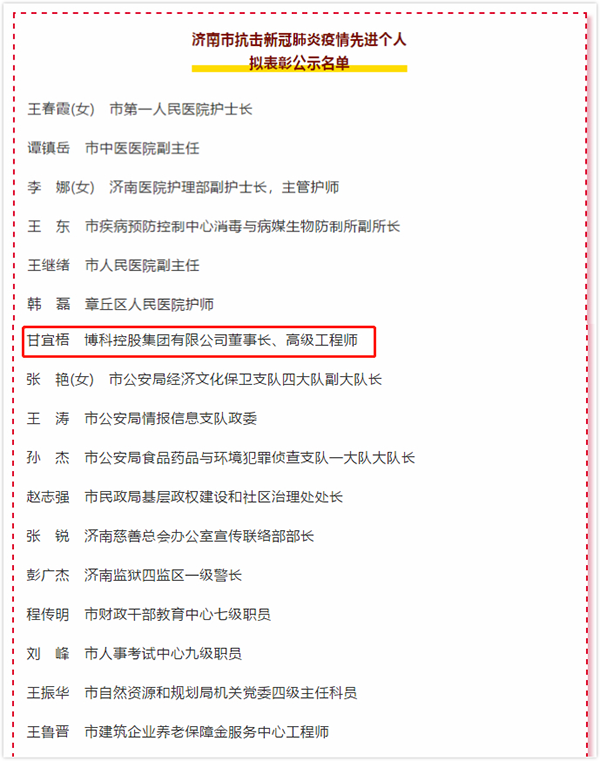 近日,濟南市抗擊新冠肺炎疫情評選表彰工作領(lǐng)導(dǎo)小組辦公室發(fā)布了濟南市抗擊新冠肺炎疫情先進個人擬表彰公示名單,博科控股集團有限公司董事長甘宜梧先生入圍。