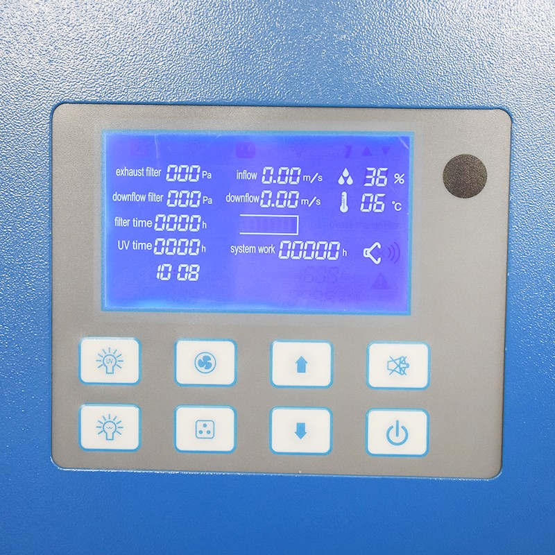9. 高亮度LCD顯示屏,實(shí)時動態(tài)顯示操作區(qū)的下降氣流流速和流入氣流流速,顯示安全柜的整體運(yùn)行時間,UV燈的運(yùn)行時間,操作區(qū)的溫度和濕度,送風(fēng)和排風(fēng)過濾器的阻力,顯示過濾器的使用時間并由條碼顯示過濾器的使用壽命,條碼全部點(diǎn)亮是過濾器壽命到期,運(yùn)行狀態(tài)全部顯示,一目了然;