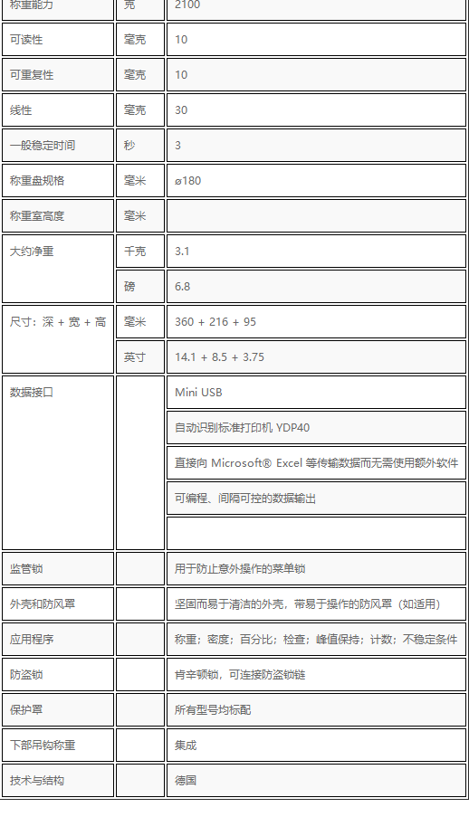 4、通過(guò)USB 端口可將數(shù)據(jù)傳輸至Microsoft® Excel 表格,進(jìn)行完整的數(shù)據(jù)記錄超大的水平調(diào)節(jié)輪及前置的水平指示氣泡,輕松完成天平的水平調(diào)整