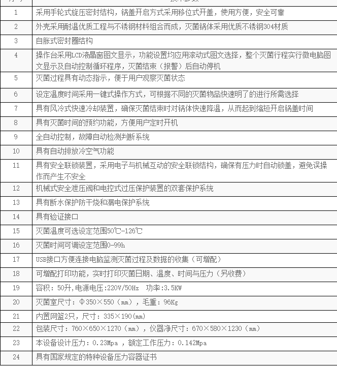 本品非醫(yī)療器械產(chǎn)品,屬于壓力容器受控產(chǎn)品,符合壓力容器設(shè)計(jì)與制作的相關(guān)規(guī)定。其結(jié)構(gòu)安全可靠,具有快捷簡(jiǎn)便的操作方式和功能齊全的控制系統(tǒng),在安全控制上;具有超壓自泄、斷水保護(hù)、超溫自控的數(shù)套安全聯(lián)鎖的裝置。本品操作系統(tǒng)采用微機(jī)自動(dòng)處理技術(shù),滅菌運(yùn)行過(guò)程實(shí)行微機(jī)自動(dòng)控制,操控臺(tái)上的液晶顯示窗顯示整個(gè)滅菌動(dòng)態(tài)和功能運(yùn)行情況,產(chǎn)品主要部件采用不銹鋼材料精制而成,是各大專(zhuān)院校、食品化工、生物科研等單位對(duì)器械、食品器皿、培養(yǎng)基等物品進(jìn)行滅菌的理想產(chǎn)品。