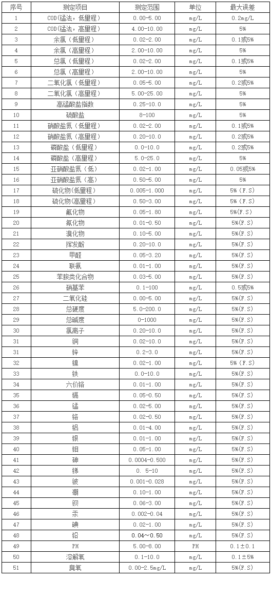 4.測量參數(shù):CODMn、CODCr、氨氮、總磷、銅、鐵、鎳、六價鉻、磷酸鹽、亞硝酸鹽等100多種個參數(shù),用戶可定制參數(shù)。