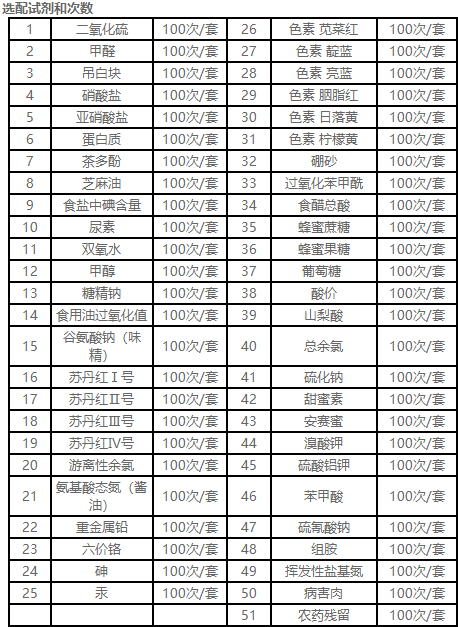 調味品成分:食醋的總酸、醬油的總酸、芝麻油純度、谷氨酸鈉、醬油氨基酸態(tài)氮、食鹽中亞鐵氰化鉀、食鹽中碘