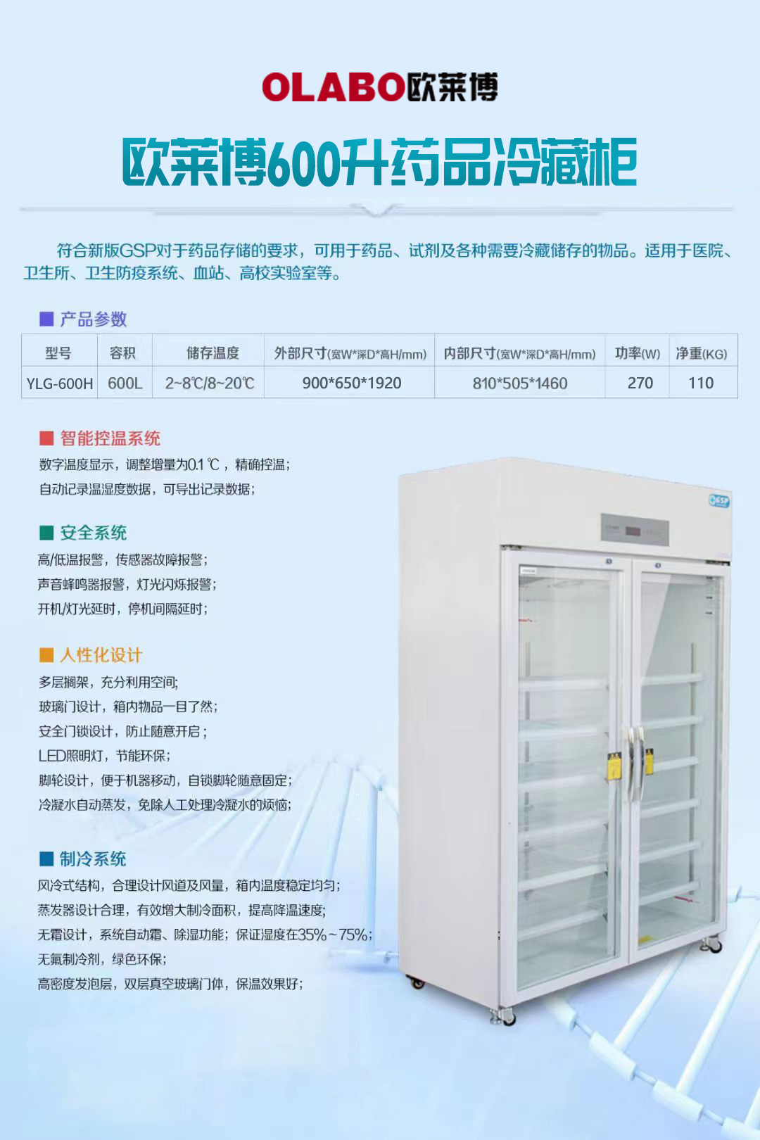 *控制性能:專利防凝露醫(yī)用冷藏箱箱體,專利內(nèi)循環(huán)通風(fēng),完全符合GSP標(biāo)準(zhǔn)