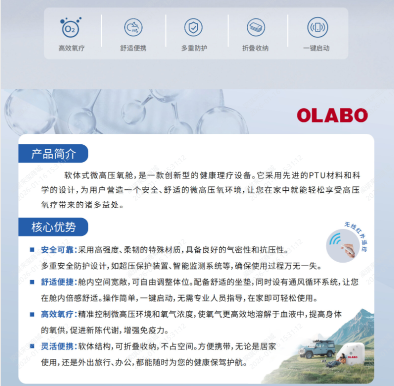 軟體式微高壓氧艙模擬高壓氧環(huán)境,通過物理作用輔助促進血液循環(huán),助力細胞新陳代謝,有助于舒緩身心、改善疲勞狀態(tài),為追求品質(zhì)生活的腦力勞動者、中老年人、運動愛好者使用、愛美人士,關注亞健康調(diào)理的人士,提供新的健康管理方案。
